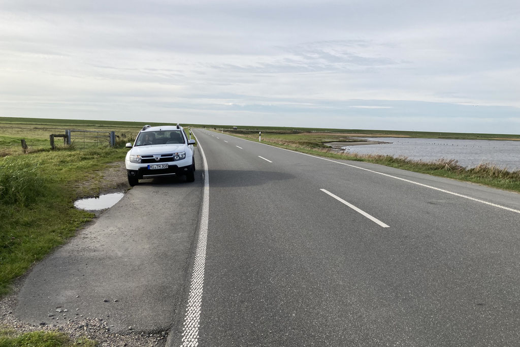 Auch im weiteren Verlauf bietet sich von der Landesstraße aus manche schöne Aussicht. Kurz nach dem Sperrwerk passiert die Route das Katinger Watt.