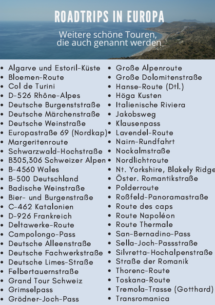 Auch in Europa, das im Vergleich zu anderen Kontinenten dichter besiedelt ist, gibt es noch eine Vielzahl schöner Asphaltrouten, die das Profil einer Panoramaroute haben. So ist es nicht verwunderlich, dass man in verschiedenen Publikationen immer wieder auf solche Routen stößt. Neben den landschaftlich beeindruckenden Strecken auf Island, den Fjord- und Meeresrouten in Skandinavien und den Berg- oder Küstenstrecken in Großbritannien findet man auch im zentralen und besonders im südlichen Europa Asphaltrouten, die sich besonders für einen Roadtrip eignen. Ob auf Gebirgsrouten, auf Strecken durch weite Ebenen und trockene Halbwüsten oder auf schönen Küstenstraßen, hier ist wohl für jeden Geschmack etwas Passendes dabei.